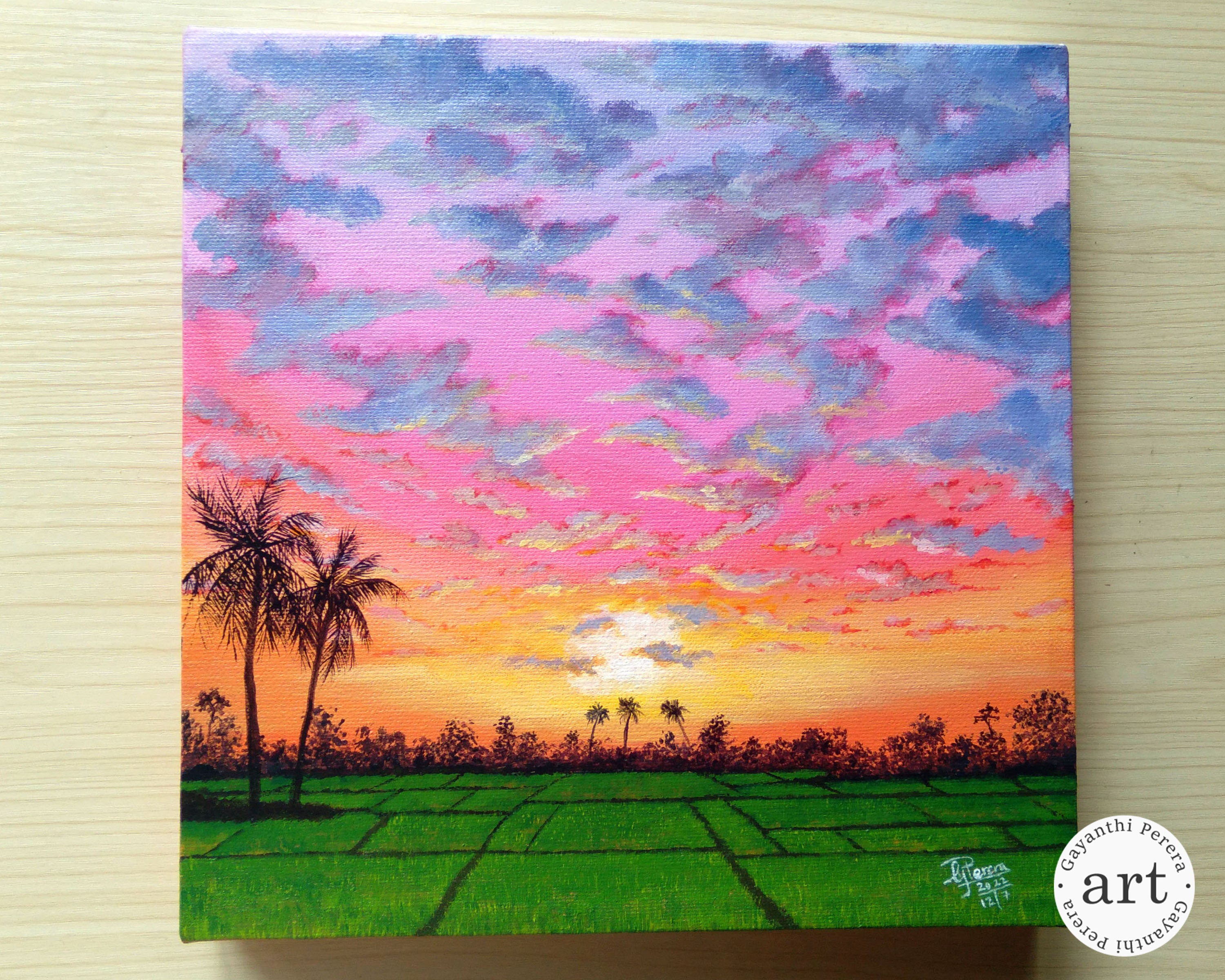 Original Landscape Acrylic Painting Bright Paddy Field Sunset Sri Lanka 10 X 10 Inches Box Canvas Gayanthi Perera Etsy